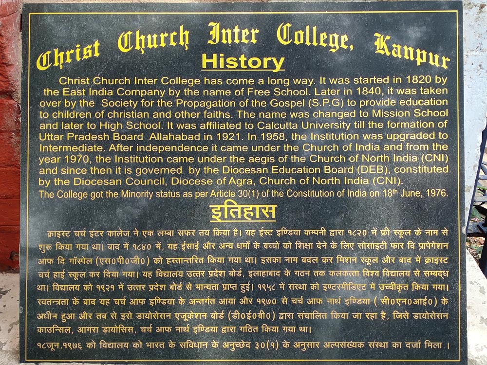 Christ Church Intermediate College has come a long way. It was started sometime in 1820 by the East India Company by the name of Free School. Later in 1840 it was taken over by the Society for the Propagation of the Gospel (SPG) to provide education to Christian Children and also the children of the faiths. The name was changed to Mission School and later to High School affiliated to Calcutta University till the formation of the U.P. Board, Allahabad in 1921. In 1958 the institution was raised to Intermediate and after independence it came under the Church of India and from the year 1970, the said church came under the umbrella of church of North India (C.N.I.), and since then it is governed by the Diocesan Education Board (D.E.B.) constituted by the Diocesan Council, Diocese of Agra, Church of North India.